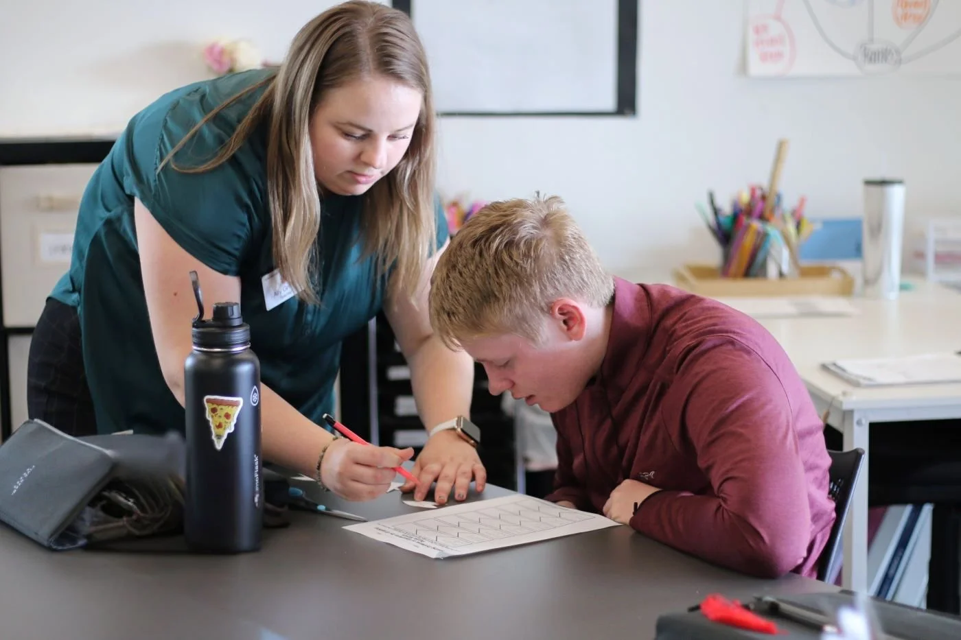 In our high school Algebra class at our North Campus, students are learning to solve systems of equations, a key algebraic concept involving how two lines interact on a graph. There are three possible outcomes: the lines can intersect at one point, never intersect at all, or overlap completely as the same line.